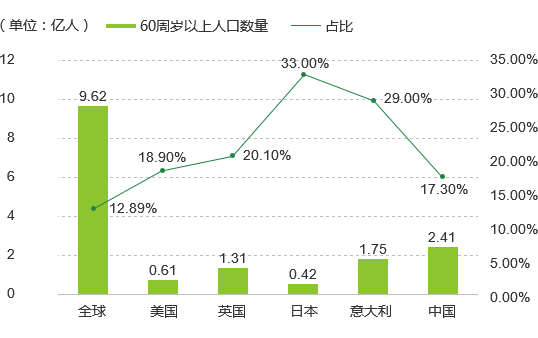 對(duì)比各國的老齡化程度和老齡化人口來看,雖然中國的60周歲以上人口占比遠(yuǎn)遠(yuǎn)不如日本和意大利,也不如美國和英國,但是從老齡化人口總量上來看,我國則遠(yuǎn)遠(yuǎn)超過以上國家,截止2017年中國人口總規(guī)模為全球人口的18.82%,老齡化人口總規(guī)模則占到全球的25.06%。