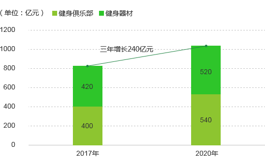 按照國際市場(chǎng)經(jīng)驗(yàn),以日本健身俱樂部會(huì)員滲透率為參考值,若我國健身俱樂部會(huì)員滲透率達(dá)到3.1%,中國健身俱樂部的會(huì)員群體將會(huì)超過4000萬,按照人均年消費(fèi)5000元估算,那么我國健身俱樂部所產(chǎn)生的市場(chǎng)規(guī)模將達(dá)到2000億元,而截止2017年,我國健身俱樂部的會(huì)員人數(shù)為800萬人,市場(chǎng)規(guī)模為400億元,按照目前的增長(zhǎng)率計(jì)算,預(yù)計(jì)到2020年,會(huì)員人數(shù)將達(dá)到1080萬人,市場(chǎng)規(guī)模將達(dá)到540億元。
