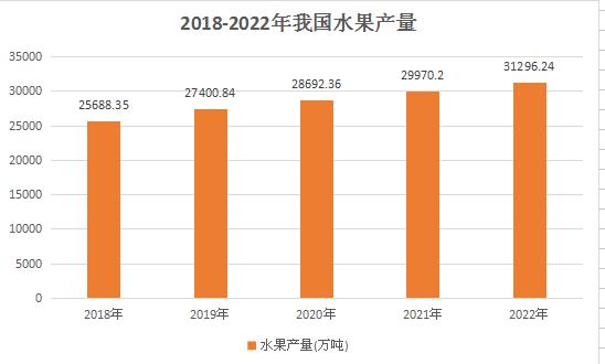 隨著社會經(jīng)濟(jì)的高速發(fā)展,人們生活水平逐漸提高,民眾對身體健康愈加重視,對水果的需求不斷增長。2016-2022年,我國水果產(chǎn)量穩(wěn)步提升。2019年我國水果產(chǎn)量為27400.84萬噸,同比增長6.67%;2020年受“全國疫情”的影響,全國經(jīng)濟(jì)增速放緩,水果產(chǎn)量為28692.36萬噸,同比增長4.71%;2022年我國水果產(chǎn)量為31296.24萬噸,同比增長4.42%。
