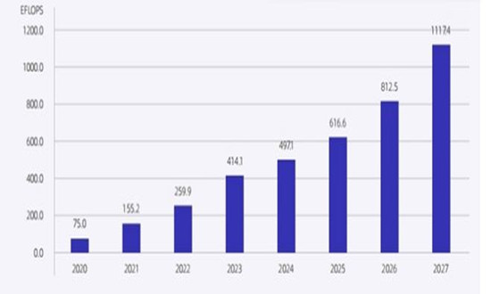 2023年,中國人工智能服務器市場規(guī)模將達91億美元,同比增長82.5%;智能算力規(guī)模預計達到414.1EFLOPS(每秒百億億次浮點運算),同比增長59.3%;2022-2027年期間,年復合增長率預計達33.9%。
