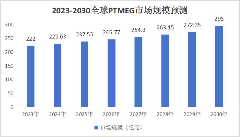 根據(jù)中研產(chǎn)業(yè)研究院發(fā)布的《2024-2029年中國PTMEG行業(yè)市場深度調(diào)研分析報(bào)告》顯示,中國是全球最大的PTMEG生產(chǎn)地,占有約60%的市場份額。2023年全球聚四氫呋喃(PTMEG)市場規(guī)模約222億元,而中國的市場規(guī)模在其中占據(jù)顯著比例。預(yù)計(jì)未來幾年內(nèi),PTMEG市場將保持穩(wěn)定增長的態(tài)勢,到2030年市場規(guī)模將接近295億元,未來六年CAGR(年復(fù)合增長率)為3.4%。這一增長主要得益于下游行業(yè)如紡織、汽車、電子以及新興領(lǐng)域如醫(yī)療、航空航天等對PTMEG需求的不斷增加。
