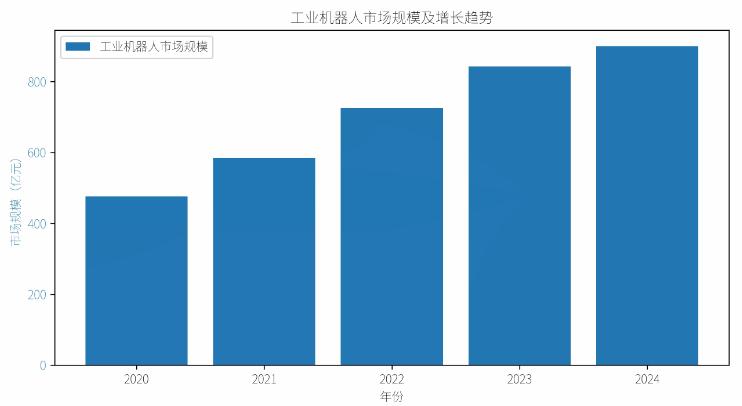全球及中國工業(yè)機器人市場規(guī)模數(shù)據(jù)顯示出市場的快速增長。2023年我國工業(yè)機器人市場銷售額增長至725.38億元,2024年進一步增長至842.62億元。預計2025年,工業(yè)機器人市場規(guī)模將達到900億元以上。