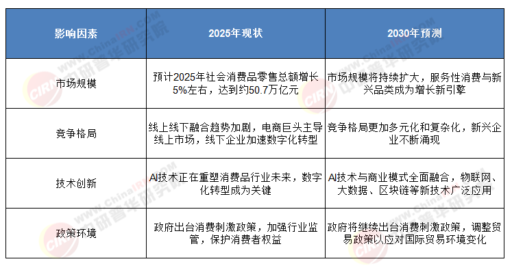表1 2025-2030年消費品貿易行業(yè)關鍵影響因素預測