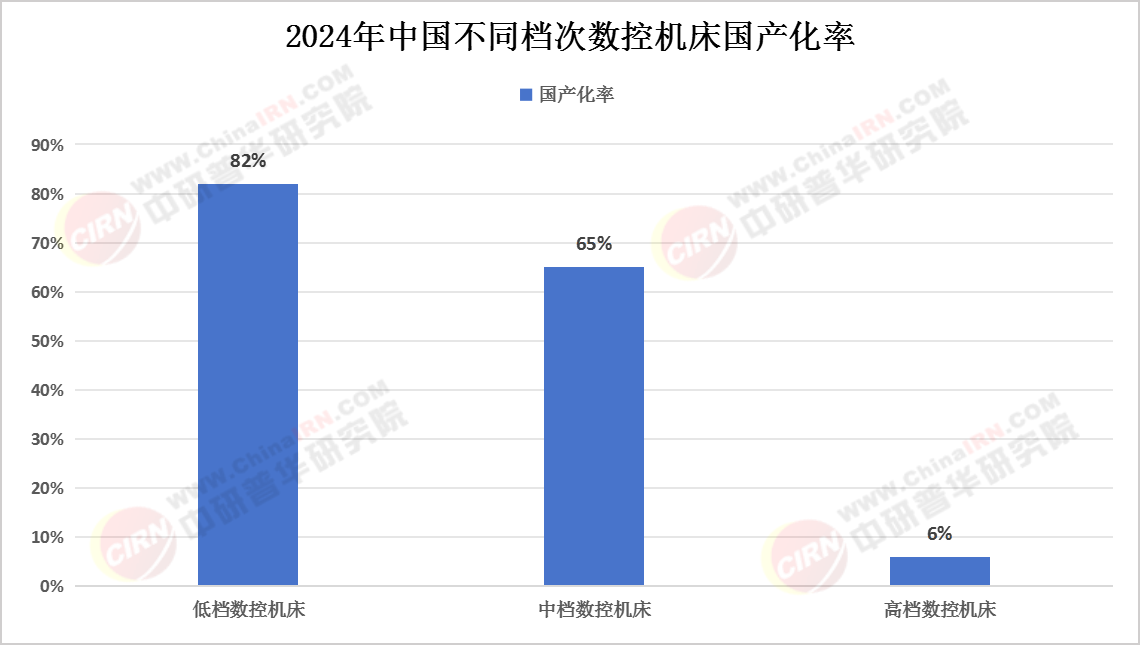 當(dāng)前,中國數(shù)控機(jī)床國產(chǎn)化率呈現(xiàn)顯著的結(jié)構(gòu)性分化特征。中低端市場已實現(xiàn)較高程度的國產(chǎn)化替代,其中中端數(shù)控機(jī)床國產(chǎn)化率達(dá)65%,低端產(chǎn)品國產(chǎn)化率更是高達(dá)82%,表明國內(nèi)企業(yè)在常規(guī)加工場景中已具備較強競爭力。然而,高端數(shù)控機(jī)床領(lǐng)域國產(chǎn)化率僅6%,進(jìn)口依賴問題突出,核心原因在于高精度主軸、數(shù)控系統(tǒng)、伺服電機(jī)等關(guān)鍵部件的技術(shù)壁壘較高,長期被德國、日本等國際巨頭壟斷。