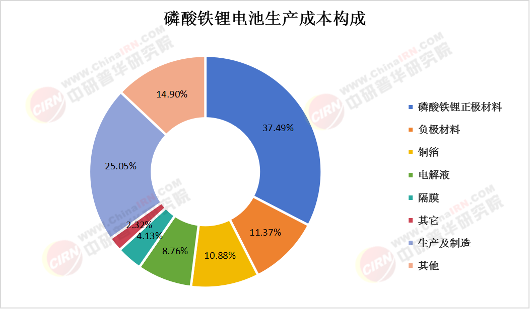 根據(jù)中研普華產(chǎn)業(yè)研究院的《2024-2029年中國(guó)磷酸鐵鋰電池行業(yè)深度調(diào)研及投資機(jī)會(huì)分析報(bào)告》顯示,LFP電池的上游原材料成本占比為:正極材料 37.49%,負(fù)極材料 11.37%,銅箔 10.88%,電解液 8.76%,隔膜 2.32%。這五類材料合計(jì)約占整車成本的70%以上,顯示正極材料是成本控制的關(guān)鍵環(huán)節(jié)。