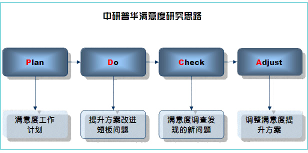 滿(mǎn)意度研究不僅僅能夠揭示企業(yè)目前發(fā)展中的問(wèn)題,更重要的是能夠作為企業(yè)產(chǎn)品和服務(wù)的重要依據(jù),促進(jìn)企業(yè)整體競(jìng)爭(zhēng)力的發(fā)展。在此思路指導(dǎo)之下,中研普華的滿(mǎn)意度研究遵循以下PDCA的四階段,在每一階段,中研普華均與客戶(hù)一起,為客戶(hù)提供從調(diào)研解讀到管理咨詢(xún)的端對(duì)端服務(wù)。