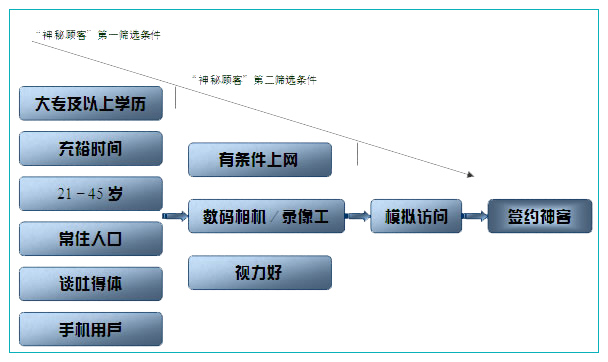 根據(jù)所有應(yīng)測評門店分布情況,各區(qū)域督導(dǎo)按照如下招聘流程錄用合適的"神秘顧客"