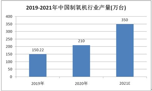 數(shù)據(jù)顯示,2019年國內(nèi)制氧機(jī)行業(yè)產(chǎn)量達(dá)到150.22萬臺(tái),到2020年增長到了210萬臺(tái),較2019年增長了69.78萬臺(tái),增長率達(dá)到46.45%。預(yù)計(jì)到2021年制氧機(jī)行業(yè)產(chǎn)量將達(dá)到350萬臺(tái)。其中,由于國外需求大增,增量中相當(dāng)一部分是用于出口。