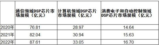 DSP芯片行業(yè)主要應(yīng)用領(lǐng)域分別是通信領(lǐng)域、計(jì)算機(jī)領(lǐng)域和消費(fèi)電子自動(dòng)控制領(lǐng)域,通信領(lǐng)域2022年DSP芯片市場規(guī)模為87.61億元,計(jì)算機(jī)領(lǐng)域2022年DSP芯片市場規(guī)模為33.05億元,消費(fèi)電子和自動(dòng)控制領(lǐng)域DSP芯片市場規(guī)模為16.7億元,平均年增速為10%。