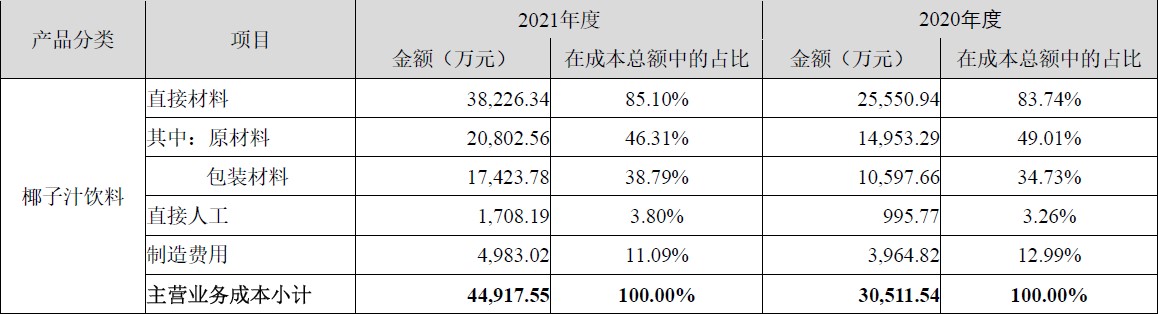 圖表:2020-2021年歡樂家公司椰汁成本構(gòu)成