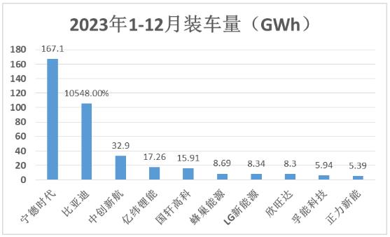 2023年1-12月裝車量中,寧德時代為167.1GWh,市占率為43.11%;比亞迪為105.48GWh,市場份額為27.21%;第三~第十企業(yè)分別為:中創(chuàng)新航(32.9GWh)、億緯鋰能(17.26GWh)、國軒高科(15.91GWh)、蜂巢能源(8.69GWh)、LG新能源(8.34GWh)、欣旺達(dá)(8.3GWh)、孚能科技(5.94GWh)、正力新能(5.39GWh)。