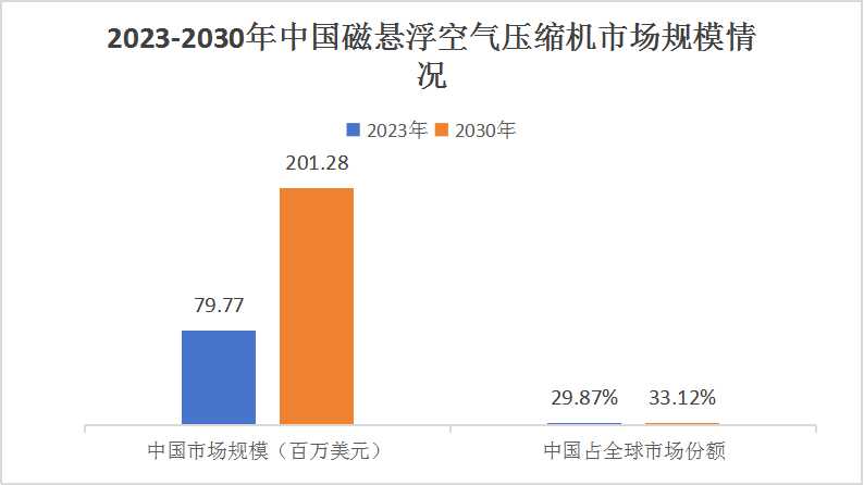 據(jù)中研產(chǎn)業(yè)研究院發(fā)布的《2024-2029年中國(guó)磁懸浮離心空氣壓縮機(jī)行業(yè)競(jìng)爭(zhēng)分析及發(fā)展預(yù)測(cè)報(bào)告》數(shù)據(jù),中國(guó)磁懸浮離心空氣壓縮機(jī)市場(chǎng)在全球市場(chǎng)中占據(jù)重要地位。2023年,中國(guó)市場(chǎng)規(guī)模達(dá)到79.77百萬(wàn)美元,占據(jù)全球近三成的市場(chǎng)份額(29.87%),并預(yù)計(jì)在未來(lái)幾年內(nèi)將持續(xù)領(lǐng)跑。到2030年,中國(guó)市場(chǎng)規(guī)模將躍升至201.28百萬(wàn)美元,全球占比提升至33.12%。這一增長(zhǎng)趨勢(shì)得益于中國(guó)制造業(yè)的快速發(fā)展及對(duì)高效節(jié)能技術(shù)的迫切需求。
