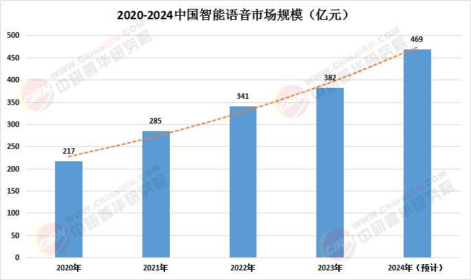 中國市場作為全球最大的市場之一,其語音技術市場規(guī)模也在持續(xù)擴大。數(shù)據(jù)顯示,2022年中國智能語音市場規(guī)模已達到341億元,近五年年均復合增長率為22.79%,同比增長13.4%。2023年中國智能語音市場規(guī)模達到382億元,2024年則有望達到469億元。