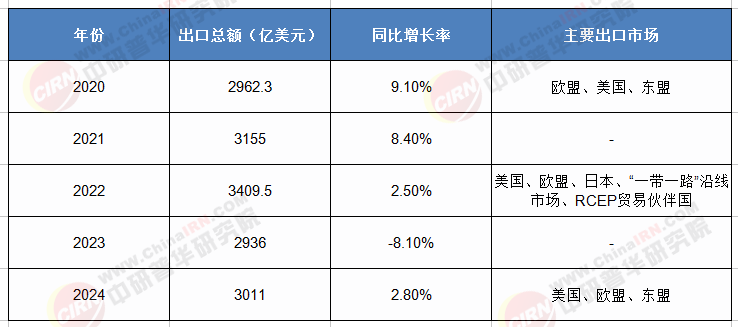 圖表1:2020-2024年中國紡織品服裝出口數(shù)據(jù)圖