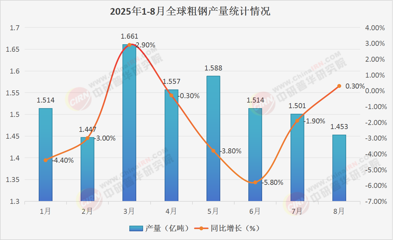 圖表:2025年1-8月全球粗鋼產(chǎn)量統(tǒng)計(jì)情況