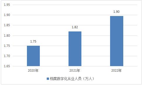 2020年中國(guó)檔案數(shù)字化從業(yè)人員為1.75萬(wàn)人,2021年檔案數(shù)字化從業(yè)人員為1.82萬(wàn)人,2022年檔案數(shù)字化從業(yè)人員為1.9萬(wàn)人。
