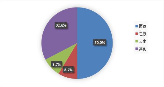 通過(guò)國(guó)內(nèi)第三方工商注冊(cè)信息查詢機(jī)構(gòu)-"企查查"查詢"彌散供氧設(shè)備"結(jié)果顯示,通過(guò)"存續(xù)和在業(yè)"選擇,西藏地區(qū)是主要的需求地區(qū),該地區(qū)行業(yè)供給企業(yè)占比第一,達(dá)到50%,江蘇省、云南省并列第二,占比為8.7%。