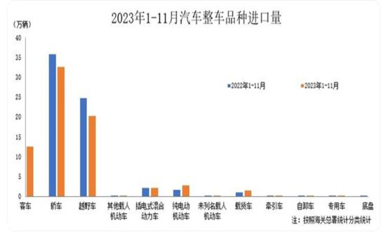 2023年1-11月,汽車整車共進口71.9萬輛,同比下降11.7%;整車進口金額427.4億美元,同比下降14%。在汽車主要進口品種中,與上年同期相比,轎車、越野車和小型客車進口量均較快下降。1-11月,上述三大類汽車品種共進口65.3萬輛,占汽車進口總量的90.8%。