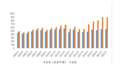 2022年全球鈦礦產(chǎn)量合計950萬噸,其中鈦鐵礦產(chǎn)量890萬噸,占比94%左右,金紅石產(chǎn)量59萬噸,占比約6%。根據(jù)美國地質(zhì)調(diào)查局數(shù)據(jù),2022年全球鈦鐵礦產(chǎn)量890萬噸,近年來全球鈦鐵礦產(chǎn)量呈現(xiàn)增長態(tài)勢,但從區(qū)域來看,鈦鐵礦供給的增長主要來自于中國,2018年-2022年產(chǎn)量從180萬噸上升到340萬噸;2022年海外鈦礦產(chǎn)量為550萬噸,盡管近五年有小幅增長,但仍然低于2013年高位水平。2022年全球金紅石產(chǎn)量59萬噸,2018年-2022年整體穩(wěn)定在60萬噸上下波動。整體來看,近年國內(nèi)鈦礦供給呈現(xiàn)穩(wěn)步釋放的態(tài)勢,海外鈦礦供給釋放則相對穩(wěn)定。