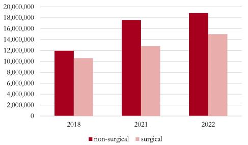 全球醫(yī)美2022年的增長一部分來自于新冠疫后消費修復,但是與2018年相比手術和非手術項目量仍然表現(xiàn)出穩(wěn)健的增速。從全球看,發(fā)達國家的成熟市場也依然在增長。