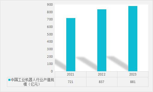 圖表:2021-2023年中國(guó)工業(yè)機(jī)器人行業(yè)產(chǎn)值規(guī)模(單位:億元)