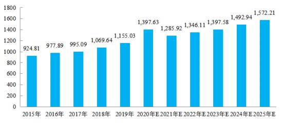 中國(guó)已成為全球最大的非織造布生產(chǎn)國(guó)。2015-2019年,我國(guó)非織造布市場(chǎng)規(guī)模呈現(xiàn)逐年增長(zhǎng)態(tài)勢(shì),其中2019年行業(yè)市場(chǎng)規(guī)模達(dá)到1,155.03億元,同比增長(zhǎng)7.98%。2020年,市場(chǎng)對(duì)無(wú)紡布等原材料的需求激增,2025年非織造布市場(chǎng)規(guī)模將達(dá)到1,572.21億元。