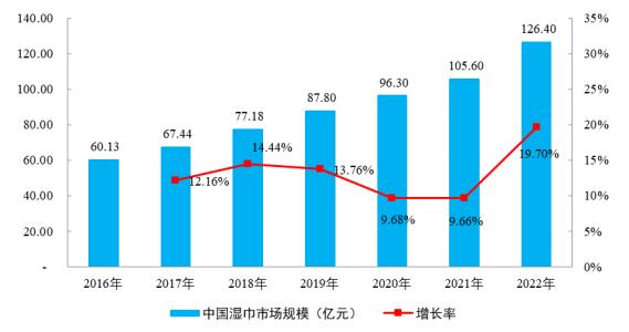 圖表:2016-2022年中國(guó)濕巾市場(chǎng)規(guī)模