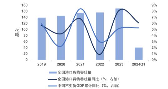 港口行業(yè)服務(wù)于腹地貨物上下水需求,行業(yè)發(fā)展成熟,吞吐量與吞吐量與GDP整體整體同步增長。2023年,全國港口實現(xiàn)貨物吞吐量169.73億噸,同比增長8.2%。其中,內(nèi)河港口完成61.39億噸,同比增長10.5%,沿海港口完成108.35億噸,增長6.9%;外貿(mào)貨物吞吐量50.47億噸,同比增長9.5%,內(nèi)貿(mào)貨物吞吐量119.26億噸,同比增長7.7%。