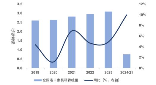 集裝箱吞吐量方面,近年來多式聯(lián)運的推廣帶動“散改集”需求旺盛,全國主要港口集裝箱吞吐量持續(xù)增長。2023年,全國港口完成集裝箱吞吐量3.10億標(biāo)準(zhǔn)箱,同比增長4.9%;其中,集裝箱鐵水聯(lián)運量完成1018萬標(biāo)準(zhǔn)箱,增長15.9%。2024年第一季度,全國港口實現(xiàn)貨物吞吐量40.89億噸,同比增長6.1%;全國港口實現(xiàn)集裝箱吞吐量0.77億標(biāo)準(zhǔn)箱,同比增長10.0%。