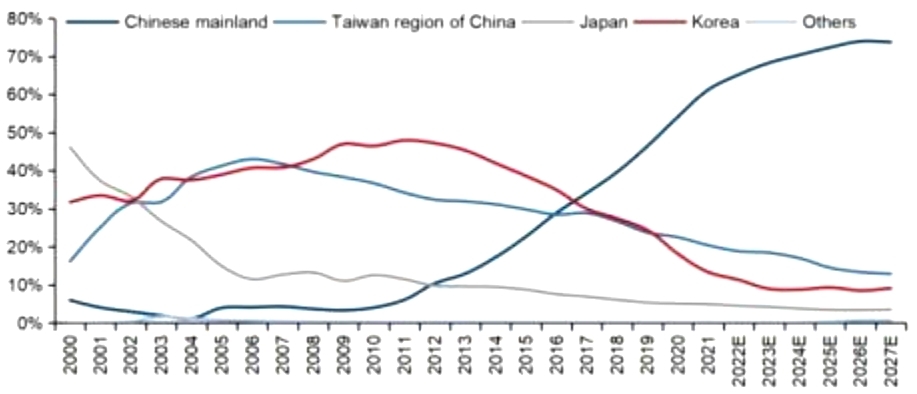 隨著韓國(guó)三星、LG逐步關(guān)?;虺鍪鬯鶕碛械腡FTLCD生產(chǎn)線,中國(guó)大陸在全球TFTLCD市場(chǎng)的占比進(jìn)一步提升。根據(jù)Omdia預(yù)測(cè),到2027年中國(guó)大陸LCD產(chǎn)能在全球的占比(按面積)將達(dá)到73.74%,占據(jù)絕對(duì)領(lǐng)先地位。