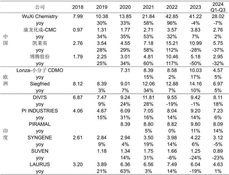 圖表:全球小分子CDMO公司收入規(guī)模(億美元)