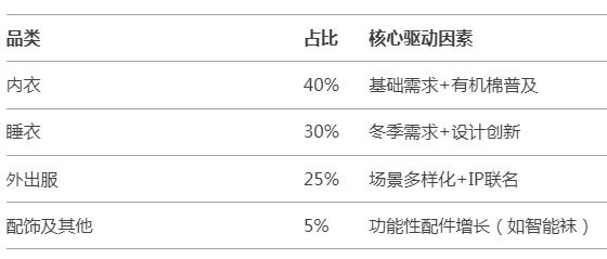 場(chǎng)景細(xì)分深化:產(chǎn)品從基礎(chǔ)內(nèi)衣、睡衣拓展至運(yùn)動(dòng)服、漢服、滑雪服等細(xì)分品類,功能性服裝占比提升至15%。