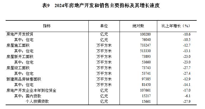 國家統(tǒng)計局數據顯示,2024年房地產開發(fā)投資100280億元,比上年下降10.6%。其中住宅投資76040億元,下降10.5%;辦公樓投資4160億元,下降9.0%;商業(yè)營業(yè)用房投資6944億元,下降13.9%。全年新建商品房銷售面積97385萬平方米。二手房交易網簽面積71812萬平方米。年末新建商品房待售面積75327萬平方米,其中商品住宅待售面積39088萬平方米。