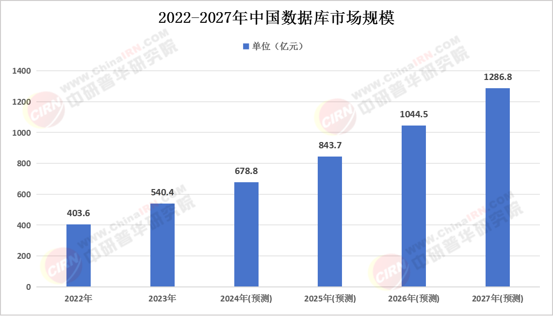 具體來看,中國數據庫市場規(guī)模近年來呈現出快速增長的態(tài)勢。2022年中國數據庫市場規(guī)模為403.6億元,而到了2023年,這一數字已增長至約540.4億元,同比增長率超過30%。報告預測,這一增長趨勢將持續(xù)下去,2024年中國數據庫市場規(guī)模將增至678.8億元,而到2027年,市場規(guī)模將進一步擴大至1286.8億元,市場年復合增長率(CAGR)為26.1%。