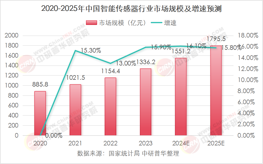 數(shù)據(jù)顯示,2020年中國(guó)智能傳感器市場(chǎng)規(guī)模為885.8億元。據(jù)中研普華產(chǎn)業(yè)研究院的《2024-2029年智能傳感器產(chǎn)業(yè)現(xiàn)狀及未來(lái)發(fā)展趨勢(shì)分析報(bào)告》預(yù)計(jì)到2025年,這一數(shù)字將達(dá)到1795.5億元,顯示出智能傳感器市場(chǎng)的高速增長(zhǎng)態(tài)勢(shì)。
