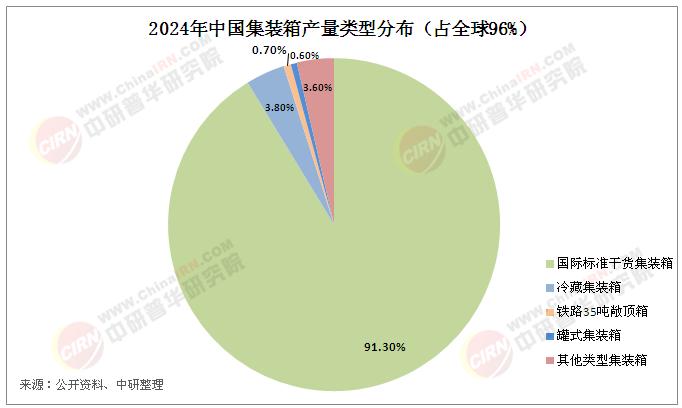 中國集裝箱行業(yè)協(xié)會發(fā)布的《中國集裝箱供應(yīng)鏈發(fā)展報告(2024)》顯示,2024年我國集裝箱產(chǎn)量占全球96%,產(chǎn)能主要分布在長三角和珠三角地區(qū)。其中,國際標(biāo)準(zhǔn)干貨集裝箱是集裝箱生產(chǎn)的主力箱型,2024年,約占我國集裝箱總產(chǎn)量的91.3%。此外,冷藏集裝箱產(chǎn)量約占我國集裝箱總產(chǎn)量的3.8%;鐵路35噸敞頂箱產(chǎn)量占比約為0.7%;罐式集裝箱產(chǎn)量占比約為0.6%;其他類型集裝箱產(chǎn)量占比約為3.6%。