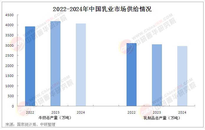 近年來,國內(nèi)奶價持續(xù)下行,原奶過剩情況嚴(yán)重。數(shù)據(jù)顯示,2024年,中國牛奶總產(chǎn)量4079萬噸,同比下降2.8%;乳制品總產(chǎn)量2962萬噸,同比下降1.86%;人均奶類消費量為41.5公斤,同比下降5.6%。生鮮乳均價降至3.32元/公斤。