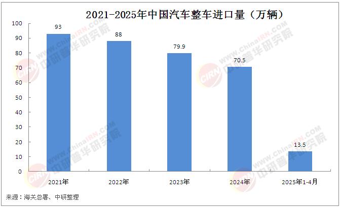 據(jù)中國汽車工業(yè)協(xié)會整理的海關總署數(shù)據(jù)顯示,2025年4月,汽車整車進口4萬輛,環(huán)比增長3.8%,同比下降21.8%;進口金額20億美元,環(huán)比增長3.3%,同比下降29%。2025年1-4月,汽車整車進口13.5萬輛,同比下降35.1%;進口金額69.4億美元,同比下降40.8%。2024年汽車整車進口70.5萬輛,同比下降11.8%;進口金額391.9億美元,同比下降16.7%。